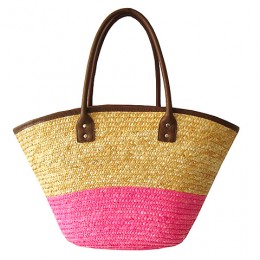 Straw Tote: Woven Wheat 2-tone w/ PU Leather Handles - Pink